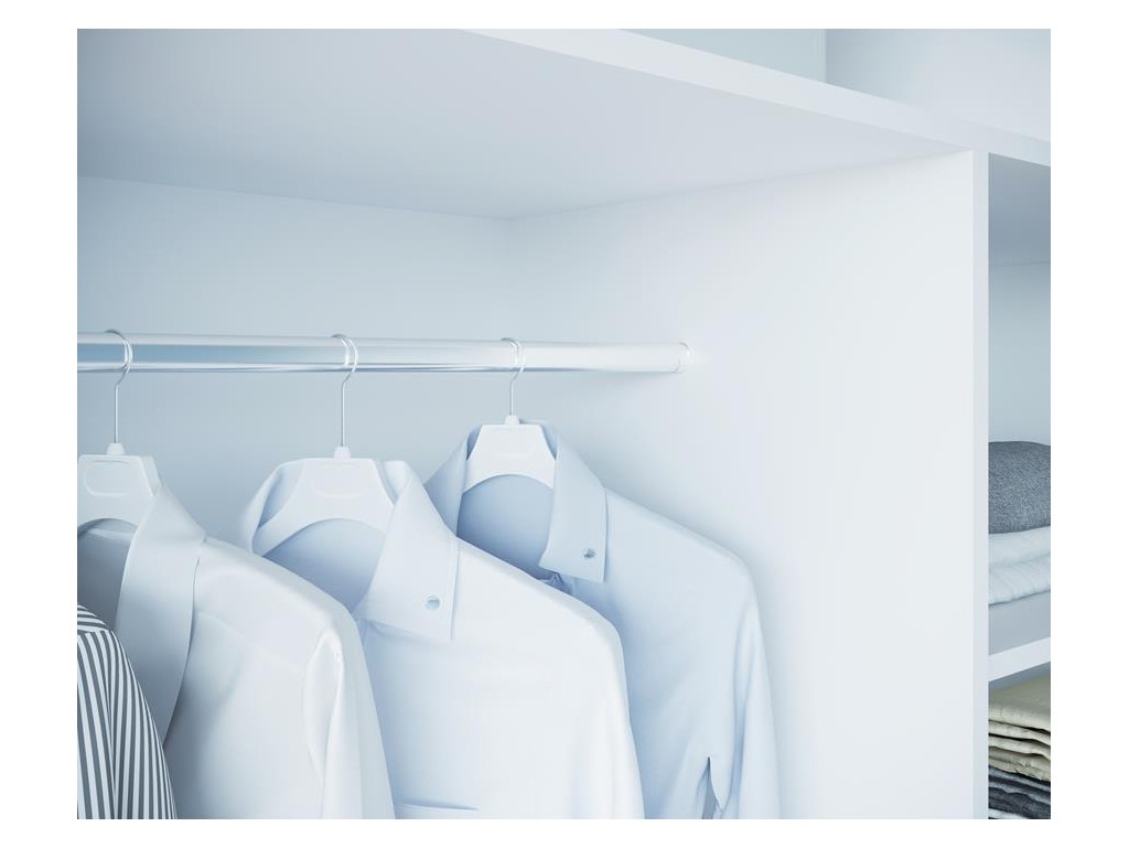 Jasne fronty optycznie powiększają wnętrze, a pojemne półki i drążek pozwalają przechowywać ubrania wiszące i drobne akcesoria.