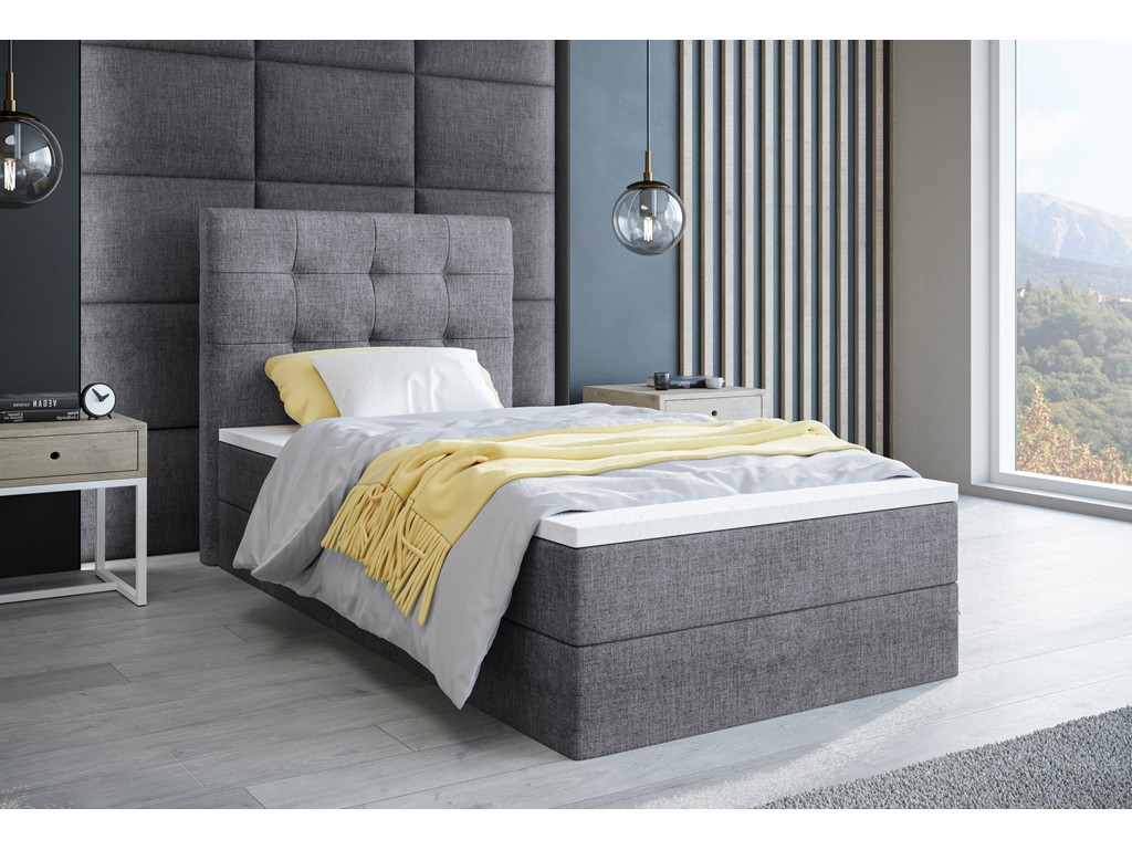 Łóżko kontynentalne Sleepy w rozmiarze 90 cm w tkaninie Sawana 21 to jednoosobowy model idealny do sypialni lub pokoju gościnnego. Jasnoszary splot tkaniny nadaje wnętrzu elegancki i przytulny charakter. Model wyposażono w wygodny materac bonelowy oraz praktyczny pojemnik na pościel.