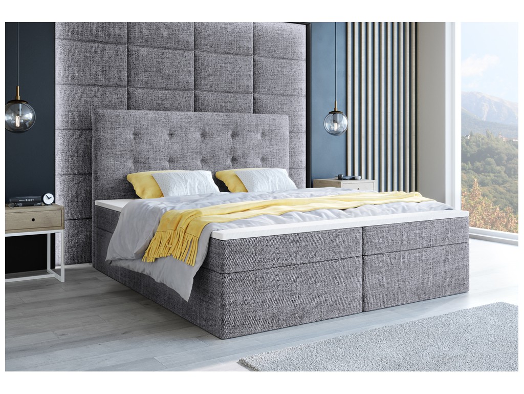 Łóżko kontynentalne Sleepy w rozmiarze 180 cm w tkaninie Sawana 21 to elegancki model dla par, łączący funkcjonalność z subtelnym, jasnoszarym stylem. Delikatna plecionka nadaje wnętrzu przytulny charakter, a dwa pojemniki na pościel ułatwiają przechowywanie. Model zapewnia wygodny materac bonelowy i komfortowe podparcie dzięki pikowanemu wezgłowiu.