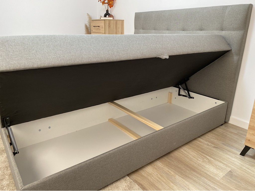 Pikowane wezgłowie zwiększa komfort siedzenia, a pojemniki umożliwiają wygodne przechowywanie pościeli.
