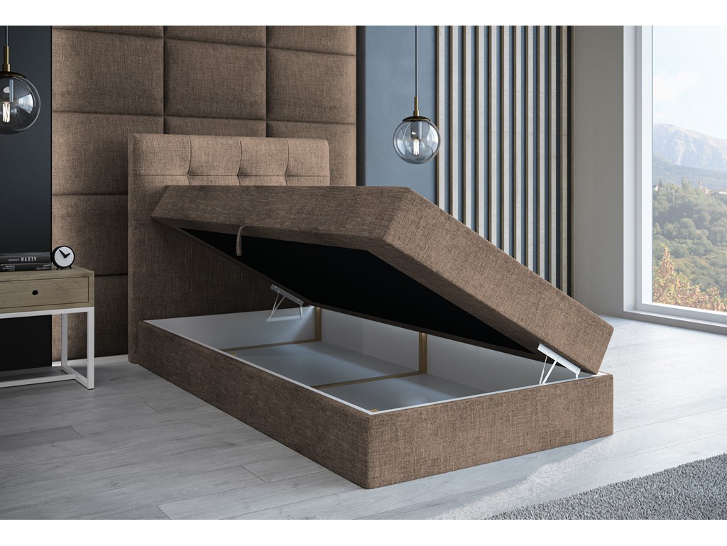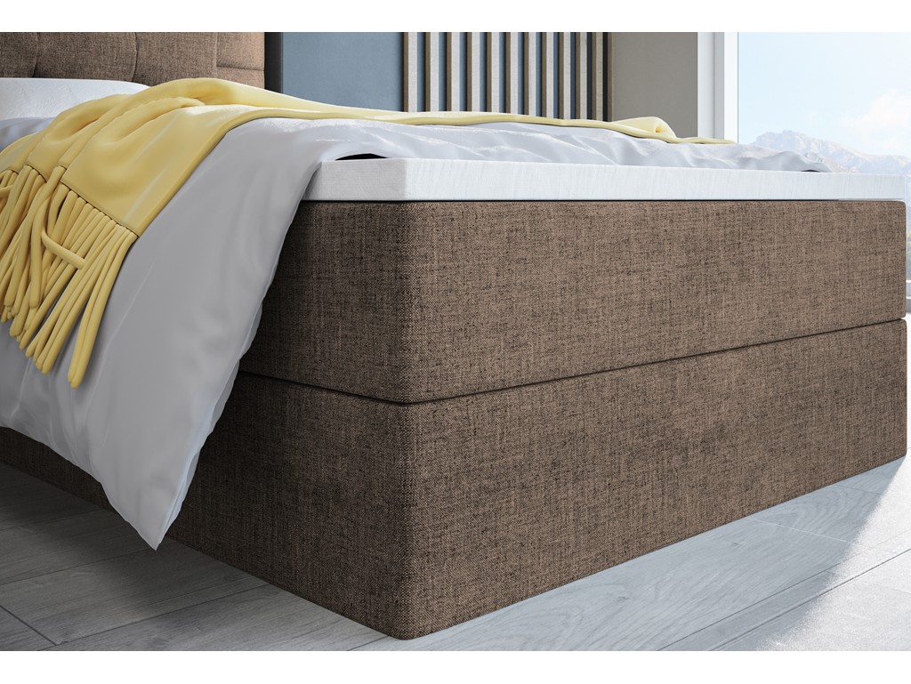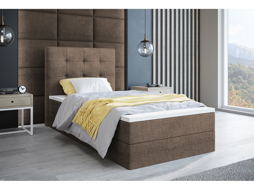 Łóżko kontynentalne Sleepy w rozmiarze 80 cm w tkaninie Sawana 25 to kompaktowy model jednoosobowy, idealny do małych sypialni lub pokoju gościnnego. Ciepły brąz plecionki nadaje wnętrzu przytulny charakter, a praktyczny pojemnik ułatwia przechowywanie pościeli. Materac bonelowy zapewnia wygodny i stabilny sen.