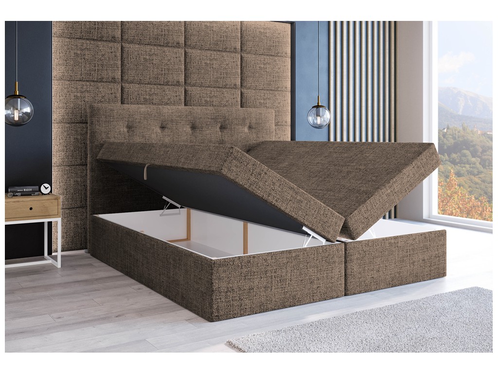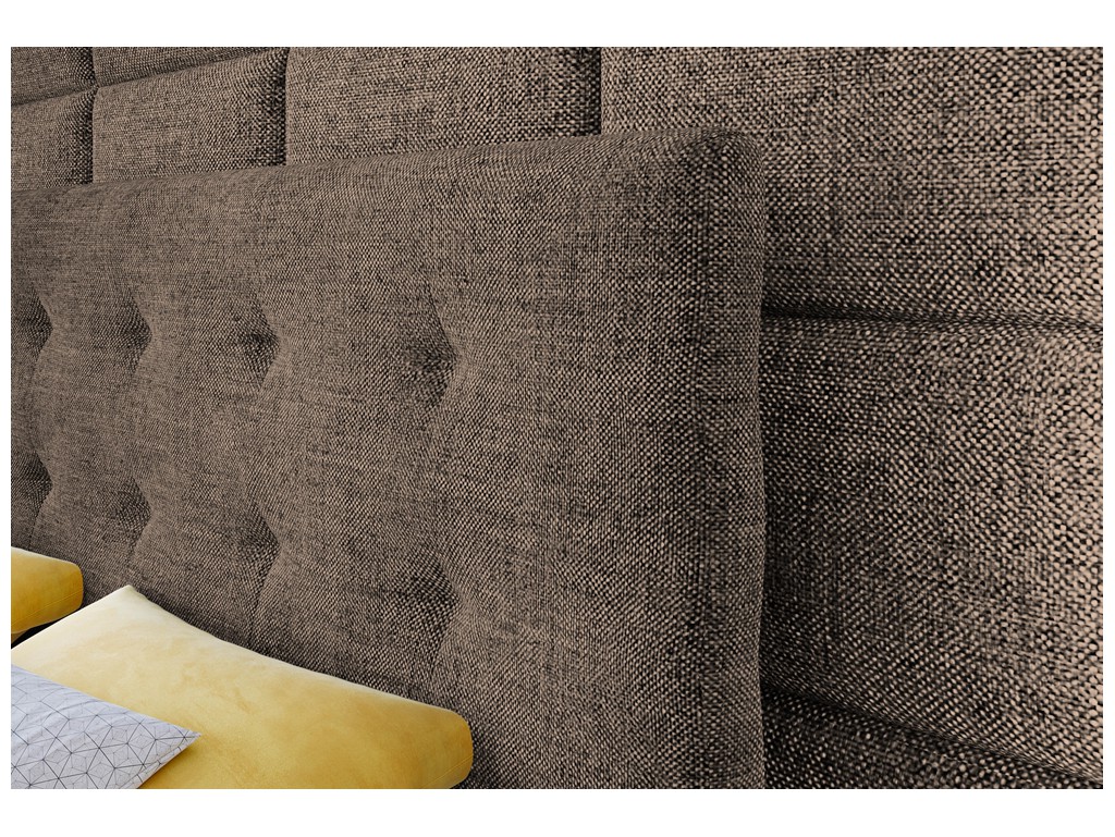 Łóżko kontynentalne Sleepy w rozmiarze 160 cm w tkaninie Sawana 25 w ciepłym brązie łączy elegancję z funkcjonalnością. Pikowane wezgłowie, pojemniki na pościel i wygodny materac zapewniają komfort codziennego użytkowania i przytulny charakter sypialni.