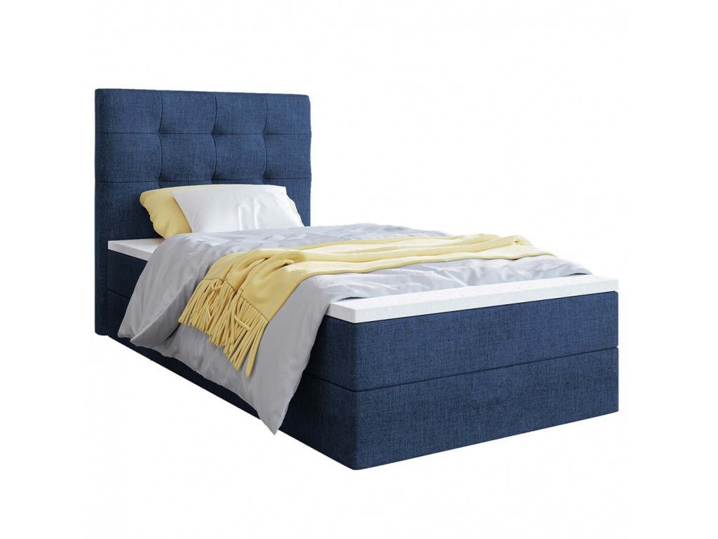 Łóżko kontynentalne Sleepy w rozmiarze 90 cm w tkaninie Sawana 80 w odcieniu niebieskiego jeansu to jednoosobowy model do sypialni, pokoju młodzieżowego lub gościnnego. Wyposażone w wygodny materac bonelowy i praktyczny pojemnik na pościel, zapewnia komfortowy sen i funkcjonalne przechowywanie.