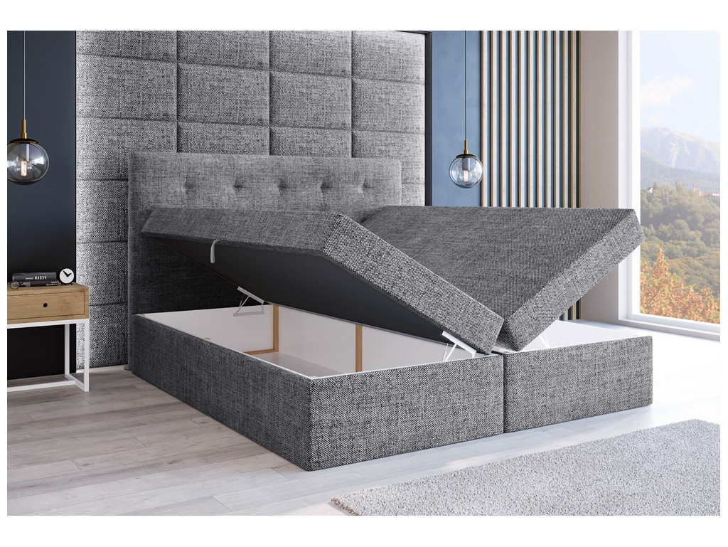 Pojemniki na pościel pomagają utrzymać porządek, a pikowane wezgłowie zwiększa komfort siedzenia.
