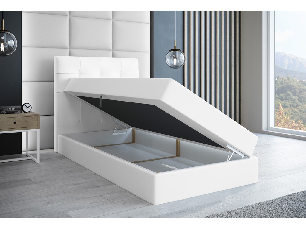 Biała ekoskóra wprowadza do wnętrza lekkość i porządek wizualny, a pojemnik pod materacem pozwala maksymalnie wykorzystać dostępną powierzchnię.