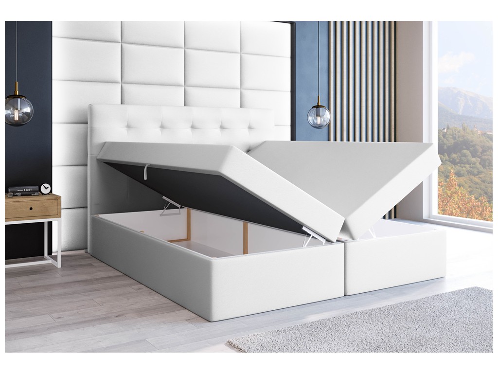 Łóżko kontynentalne Sleepy w rozmiarze 140 cm w białej ekoskórze Madryt 920 to funkcjonalna propozycja do mniejszych sypialni. Kompaktowy rozmiar, wbudowany materac bonelowy oraz dwa pojemniki na pościel zapewniają wygodę snu i praktyczne przechowywanie.