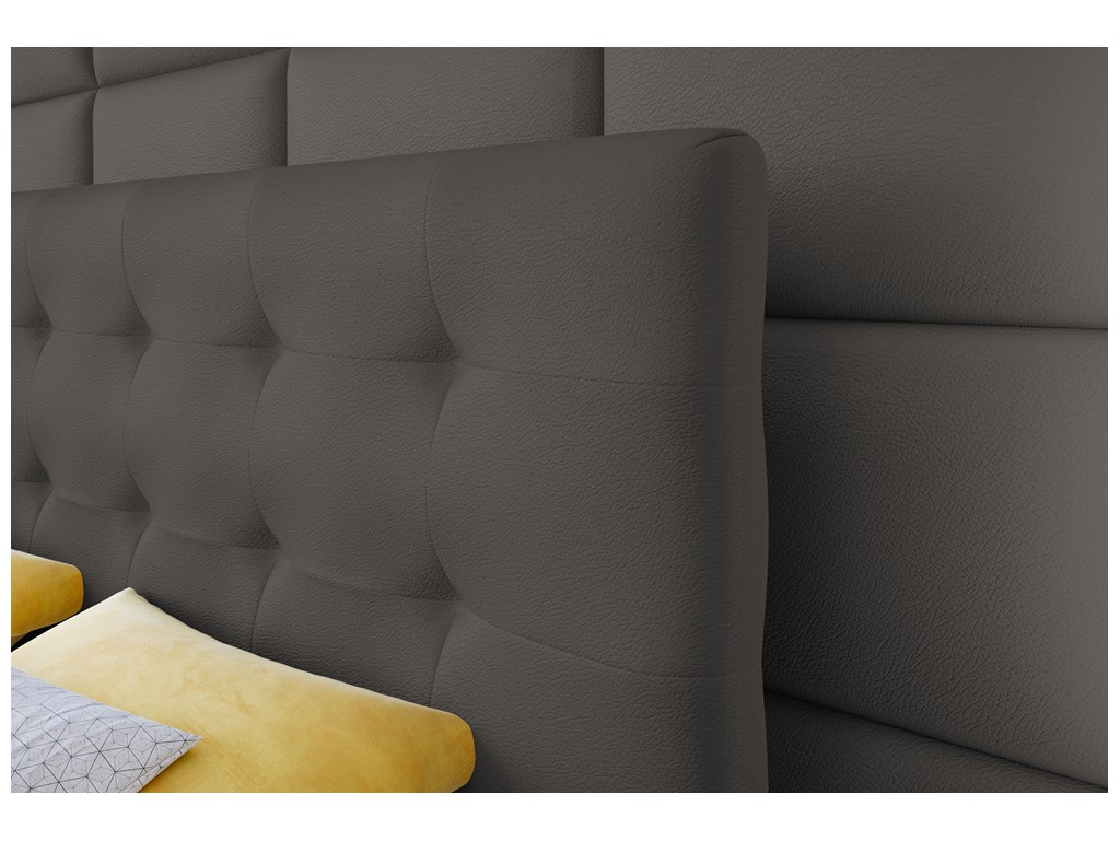 Łóżko kontynentalne Sleepy w rozmiarze 140 cm w eleganckim szarym odcieniu Madryt 995 to komfortowe rozwiązanie do średniej wielkości sypialni. Pikowane wezgłowie zapewnia przytulny charakter, a matowa ekoskóra w neutralnym szarym kolorze subtelnie odbija światło, tworząc harmonijną aranżację wnętrza. Dwa pojemniki na pościel zwiększają funkcjonalność, a materac bonelowy z pianką CollFeel gwarantuje wygodny sen.