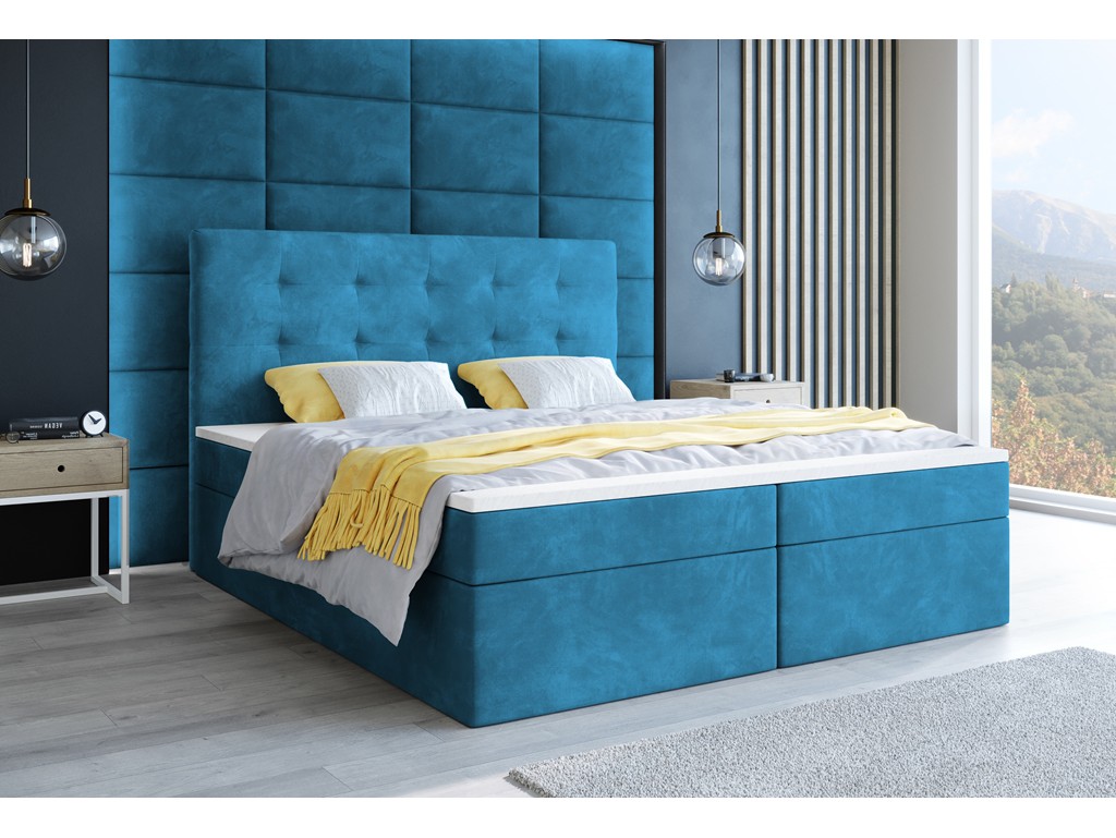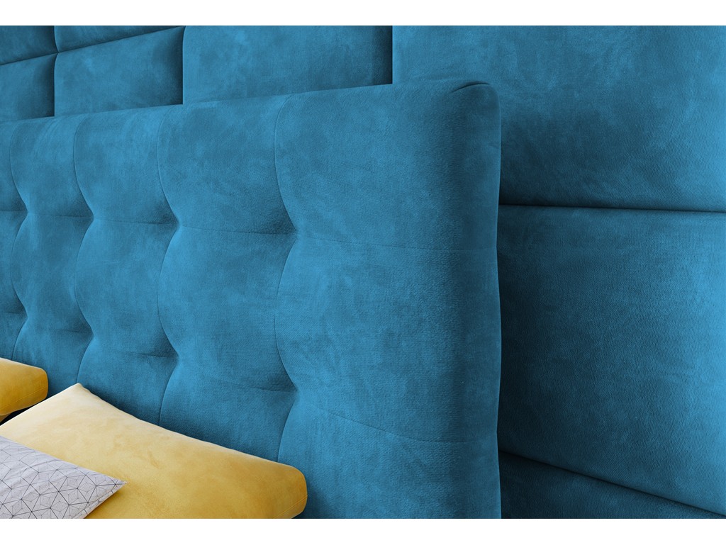 Łóżko kontynentalne Sleepy w rozmiarze 140 cm w lazurowym odcieniu Kronos 13 to komfortowa propozycja do średnich sypialni. Pikowane wezgłowie zapewnia wygodę podczas odpoczynku w pozycji siedzącej, a aksamitna tkanina subtelnie odbija światło, wprowadzając luksusowy akcent. Dwa pojemniki na pościel ułatwiają organizację przestrzeni, a materac bonelowy z pianką CollFeel gwarantuje zdrowy i wygodny sen.