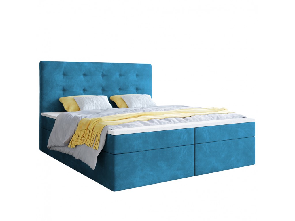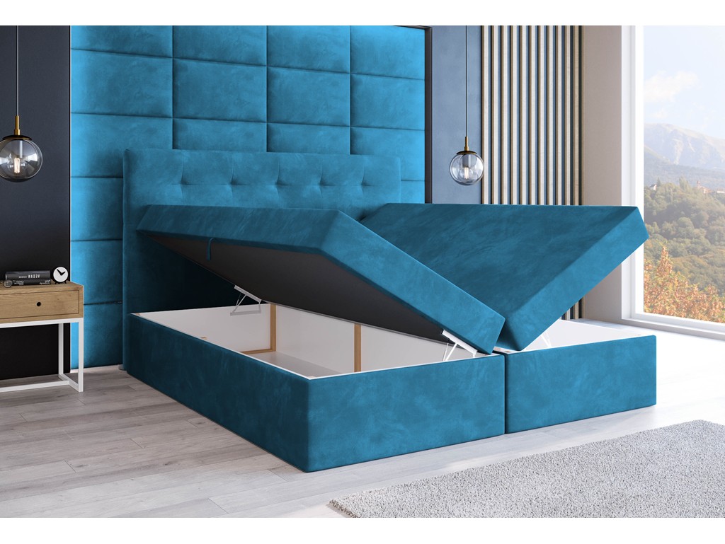 Łóżko kontynentalne Sleepy w rozmiarze 180 cm w lazurowym odcieniu Kronos 13 to elegancka propozycja do przestronnej sypialni. Pikowane wezgłowie zapewnia wygodę podczas siedzenia, a aksamitna tkanina subtelnie odbija światło, wprowadzając luksusowy akcent do wnętrza. Dwa pojemniki na pościel ułatwiają praktyczne przechowywanie, a materac bonelowy z pianką CollFeel gwarantuje zdrowy i komfortowy sen.