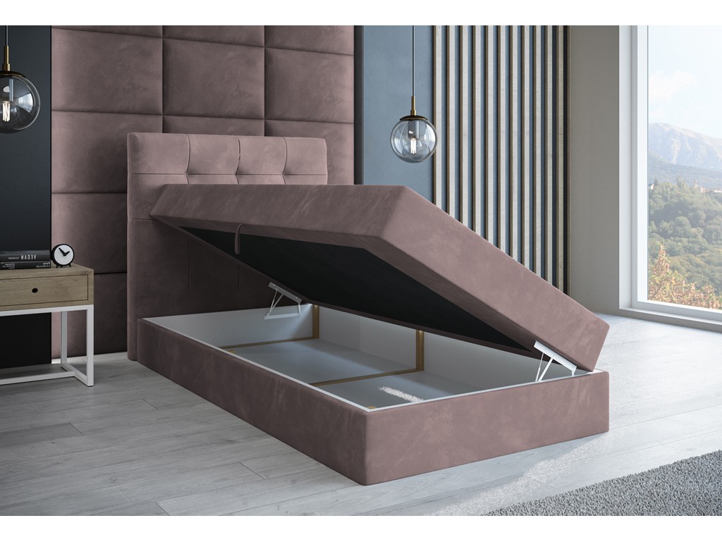 Łóżko kontynentalne Sleepy w rozmiarze 80 cm w brudnym różu Kronos 27 to kompaktowy i elegancki wybór do jednoosobowej sypialni. Pikowane wezgłowie zapewnia wygodę podczas siedzenia, a aksamitna tkanina subtelnie odbija światło, podkreślając luksusowy charakter wnętrza. Jeden pojemnik na pościel z mechanizmem sprężynowym ułatwia dostęp do schowka, wspierając funkcjonalność przestrzeni.
