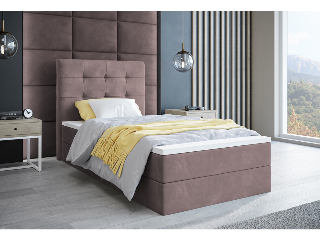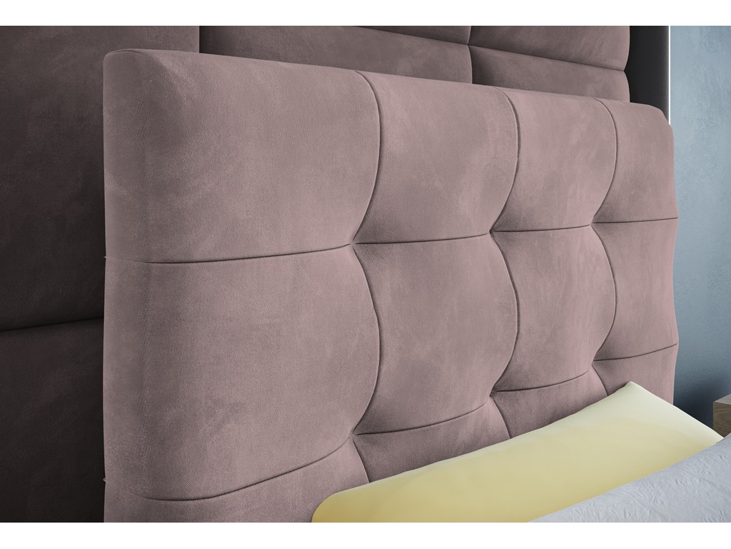 Łóżko kontynentalne Sleepy w rozmiarze 90 cm w brudnym różu to kompaktowy model jednoosobowy, łączący elegancję z funkcjonalnością. Pikowane wezgłowie i aksamitna tkanina Kronos 27 nadają przytulny charakter każdemu wnętrzu. Jeden pojemnik na pościel umożliwia praktyczne przechowywanie kołder i poduszek.
