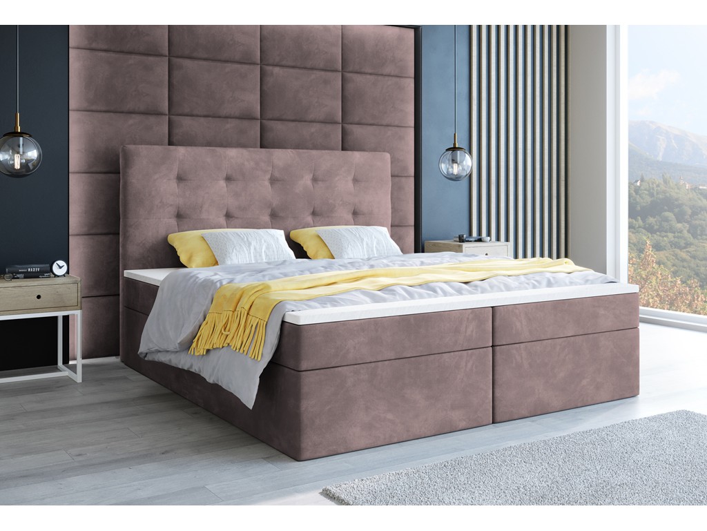 Łóżko kontynentalne Sleepy w rozmiarze 140 cm w odcieniu brudnego różu to elegancka propozycja dla par lub osób, które cenią komfort w średniej sypialni. Pikowane wezgłowie zapewnia wygodne oparcie podczas siedzenia, a aksamitna tkanina Kronos 27 subtelnie odbija światło, wprowadzając luksusowy charakter. Dwa pojemniki na pościel ułatwiają przechowywanie kołder i poduszek, a standardowa dostawa obejmuje transport do mieszkania.