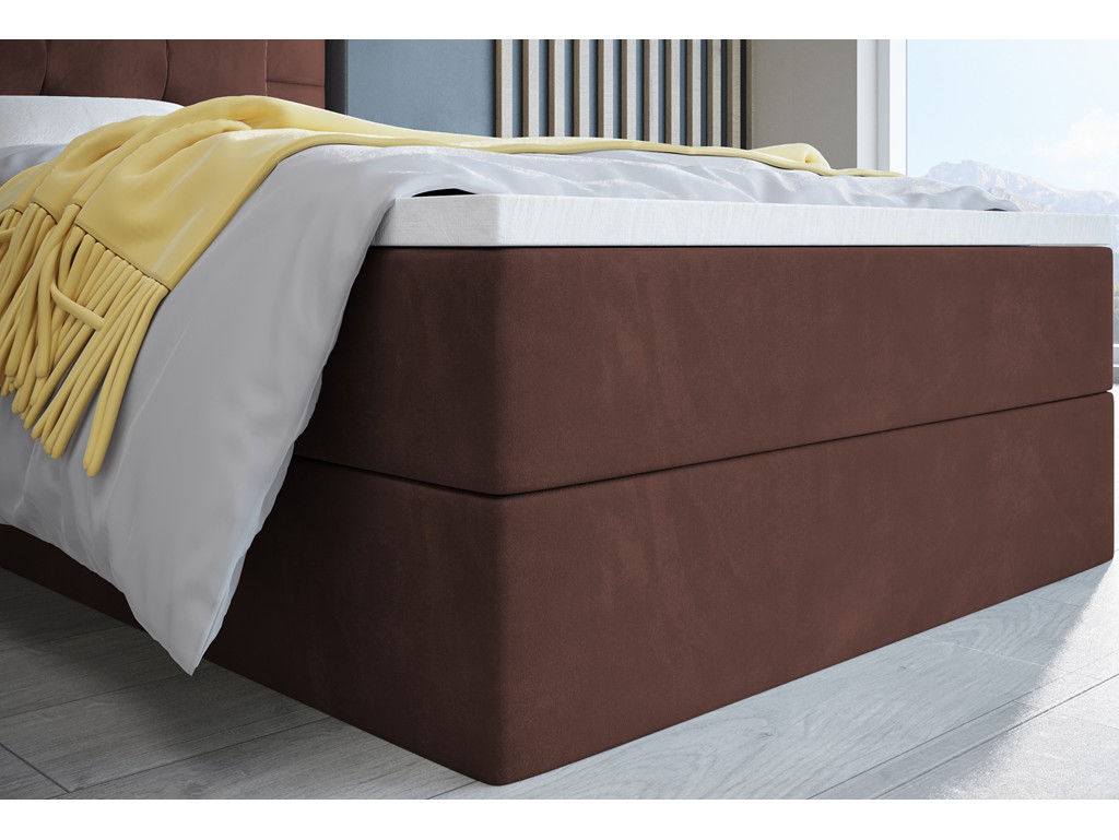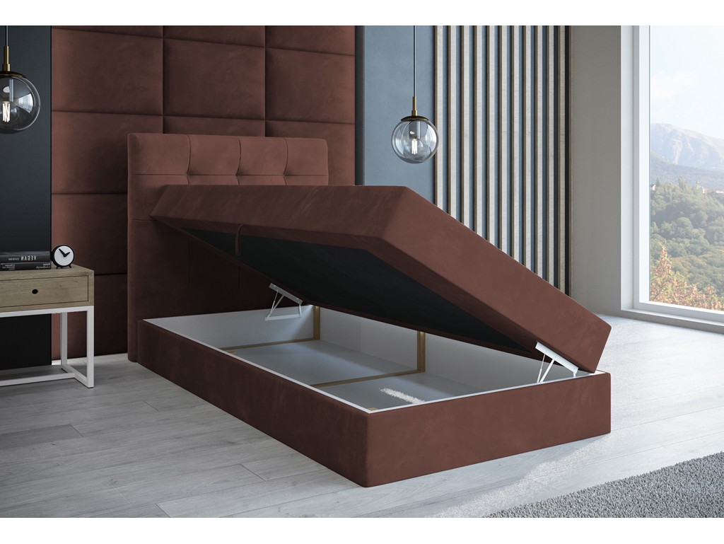 Łóżko kontynentalne Sleepy w rozmiarze 90 cm to jednoosobowy model w pastelowym odcieniu łososiowego różu, zaprojektowany z myślą o mniejszych sypialniach. Tapicerka z welurowej tkaniny Kronos 29, pikowane wezgłowie oraz wbudowany materac z pojemnikiem na pościel zapewniają komfort snu i funkcjonalność na co dzień.