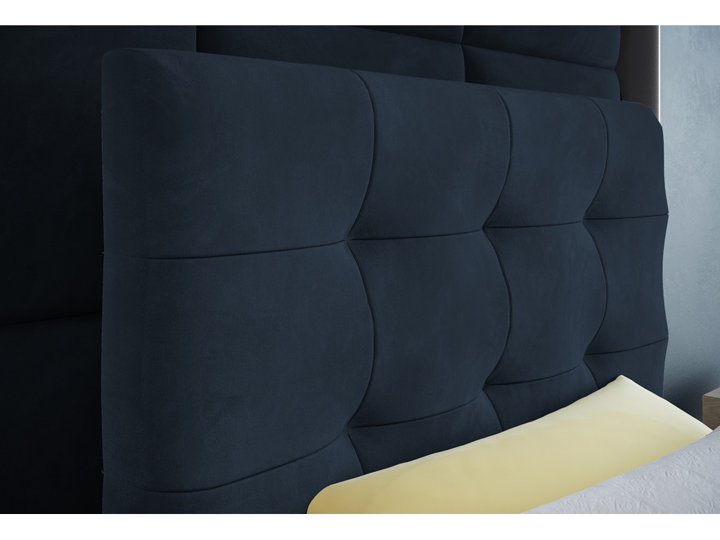 Łóżko kontynentalne Sleepy w rozmiarze 80 cm w granatowym welurze Monolith 77 to kompaktowe rozwiązanie dla jednej osoby, łączące elegancję i wygodę. Pikowane wezgłowie wprowadza przytulny charakter, a pojemnik na pościel ułatwia utrzymanie porządku. Automaty sprężynowe zapewniają łatwe korzystanie z funkcji przechowywania.