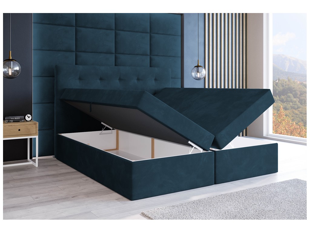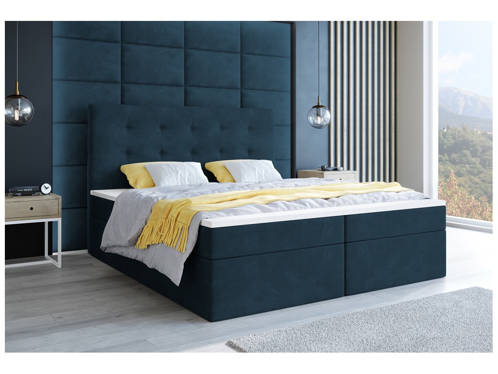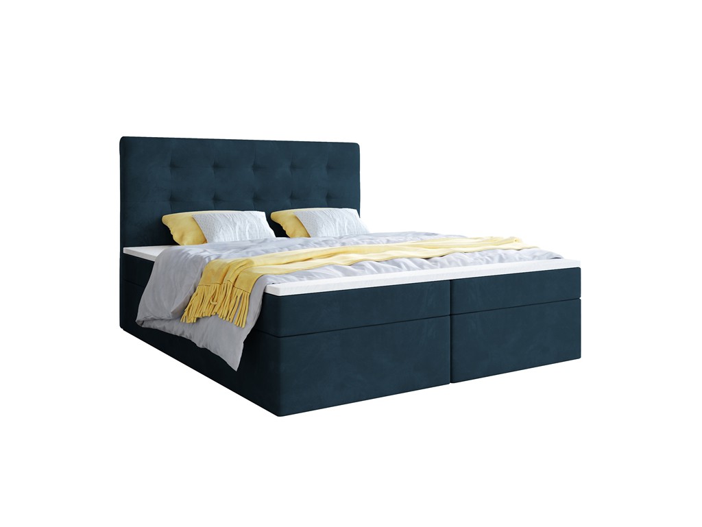 Łóżko kontynentalne Sleepy w rozmiarze 160 cm w granatowym welurze łączy elegancję z funkcjonalnością. Pikowane wezgłowie zapewnia komfort podczas siedzenia, a aksamitna tkanina subtelnie odbija światło, podkreślając luksusowy efekt. Dwa pojemniki na pościel umożliwiają przechowywanie rzeczy w porządku, a materace bonelowe i pianka CollFeel gwarantują wygodny sen dla dwóch osób.