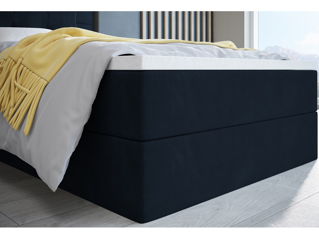 Łóżko kontynentalne Sleepy w rozmiarze 80 cm w ciemnym granatowym welurze Monolith 79 to elegancka i kompaktowa propozycja dla jednej osoby. Pikowane wezgłowie dodaje przytulności, a aksamitna tkanina subtelnie odbija światło, tworząc luksusowy efekt. Jeden pojemnik na pościel ułatwia utrzymanie porządku w mniejszych sypialniach.