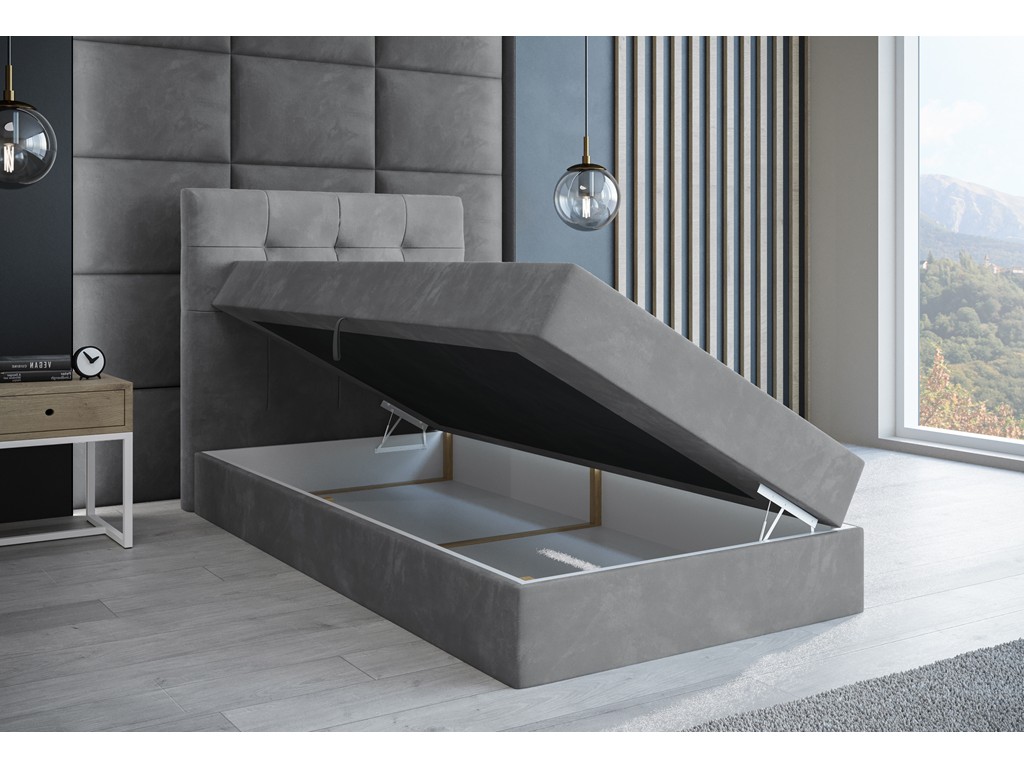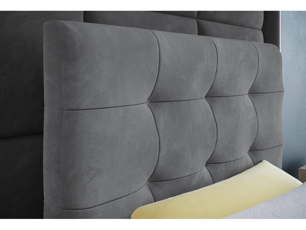 Łóżko kontynentalne Sleepy w rozmiarze 90 cm w jasnoszarym welurze Monolith 84 to praktyczny wybór do mniejszych sypialni lub pokoi młodzieżowych. Pikowane wezgłowie dodaje elegancji i komfortu, a pojemnik na pościel umożliwia wygodne przechowywanie. Solidny materac bonelowy w połączeniu z pianką CollFeel zapewnia zdrowy i wygodny sen.