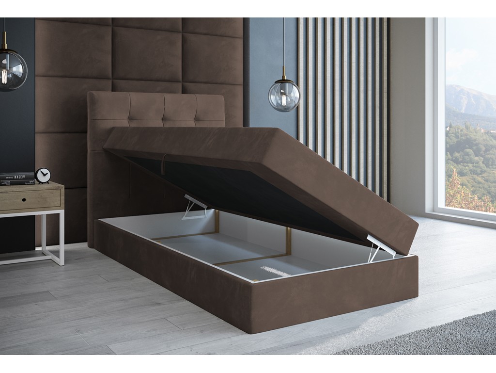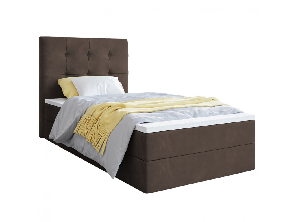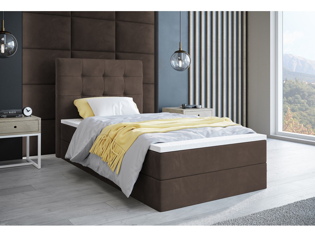 Łóżko kontynentalne Sleepy w rozmiarze 90 cm w tkaninie Monolith 15 to kompaktowe rozwiązanie do sypialni jednoosobowej, pokoju młodzieżowego lub gościnnego. Aksamitna tapicerka w kolorze mlecznej czekolady ociepla wnętrze, a pikowane wezgłowie podnosi komfort codziennego użytkowania. Model wyposażono w jeden pojemnik na pościel oraz wbudowany materac bonelowy.