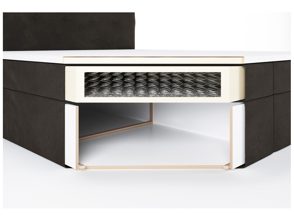 Czy powierzchnia spania wykonana jest z tej samej tkaniny co tapicerka łóżka? - Nie, powierzchnia spania została wykonana z dedykowanej czarnej tkaniny obiciowej materacowej. Takie rozwiązanie poprawia cyrkulację powietrza, zwiększa komfort snu i zapobiega ślizganiu się pościeli.