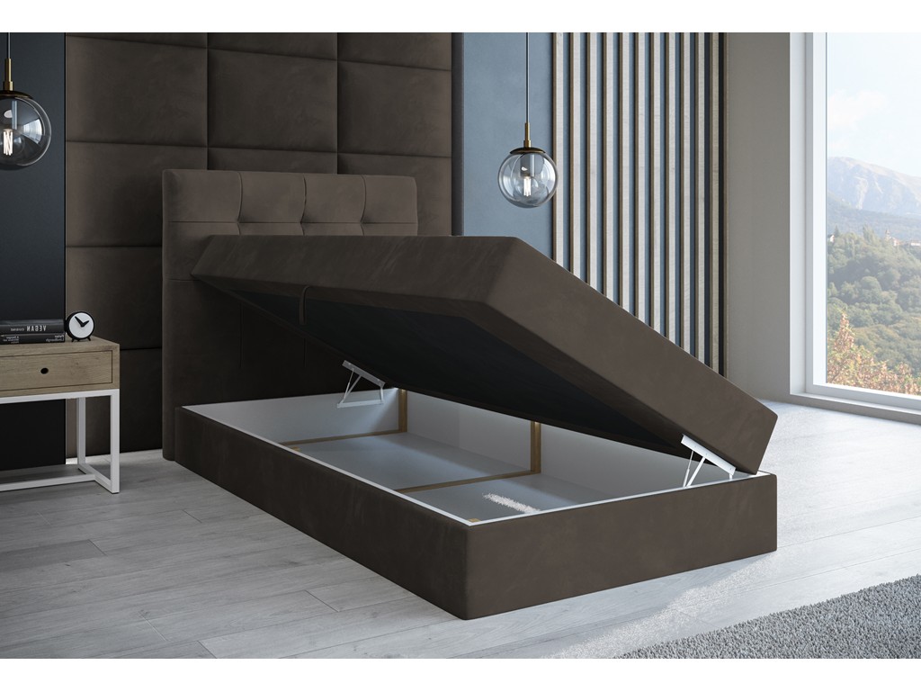 Łóżko kontynentalne Sleepy w rozmiarze 90 cm w szarym brązie Monolith 20 to wygodna opcja jednoosobowa do sypialni. Pikowane wezgłowie dodaje wnętrzu przytulnego charakteru, a aksamitna tkanina subtelnie odbija światło. Jeden pojemnik na pościel ułatwia przechowywanie pościeli i koców, a solidne automaty sprężynowe zapewniają wygodny dostęp do wnętrza.