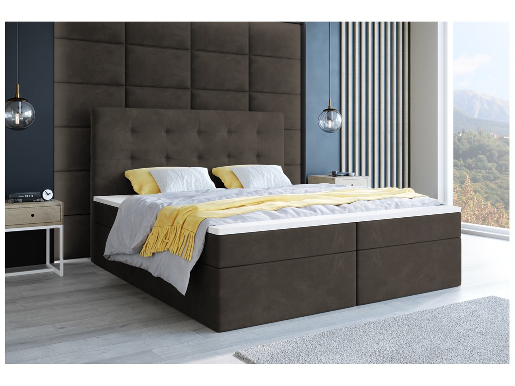 Łóżko kontynentalne Sleepy w rozmiarze 180 cm w szarym brązie Monolith 20 to elegancka i komfortowa propozycja do przestronnej sypialni dla dwóch osób. Pikowane wezgłowie zwiększa wygodę podczas relaksu, a dwa pojemniki na pościel ułatwiają utrzymanie porządku. Solidne automaty sprężynowe gwarantują łatwy dostęp do funkcjonalnego wnętrza.