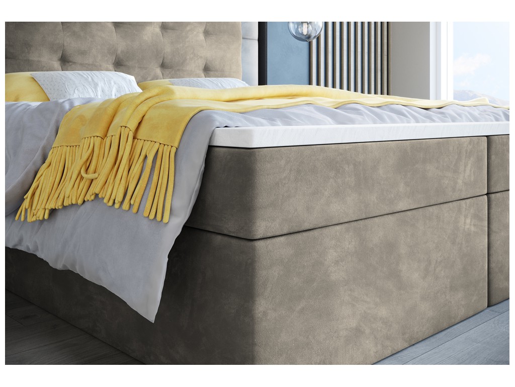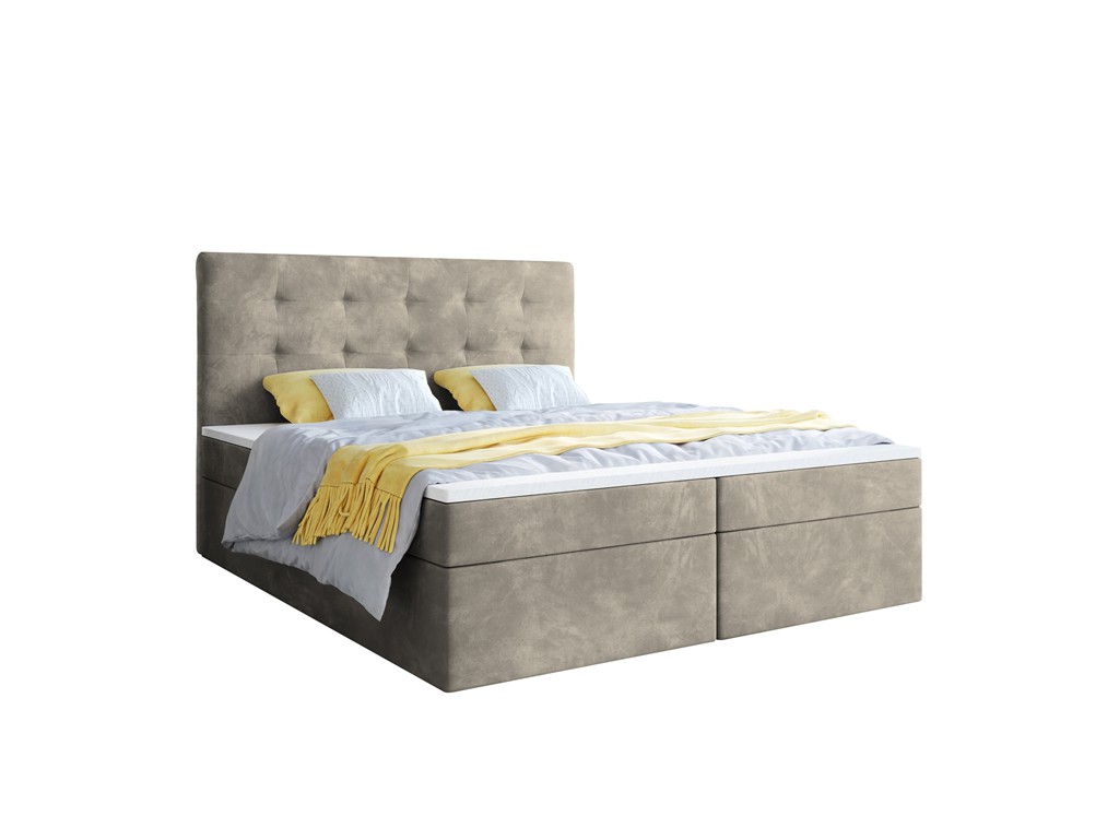 Łóżko kontynentalne Sleepy w rozmiarze 160 cm w szaro-beżowym welurze Riviera 16 to elegancka i wygodna propozycja dla dwóch osób. Pikowane wezgłowie zwiększa komfort siedzenia i podkreśla przytulny charakter sypialni, a dwa pojemniki na pościel pomagają utrzymać porządek. Solidne materace bonelowe oraz pianka CollFeel gwarantują zdrowy i wygodny sen, a automaty sprężynowe ułatwiają codzienny dostęp do przechowywanych rzeczy.