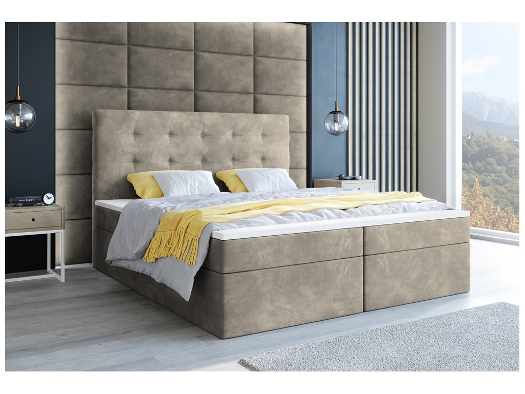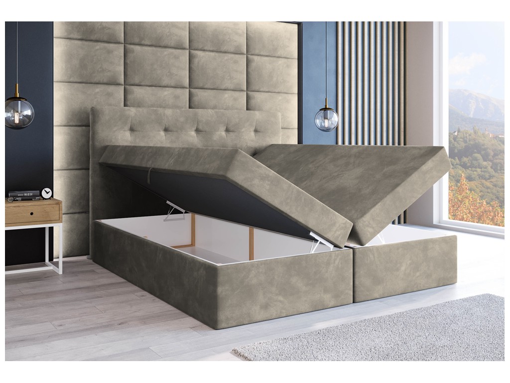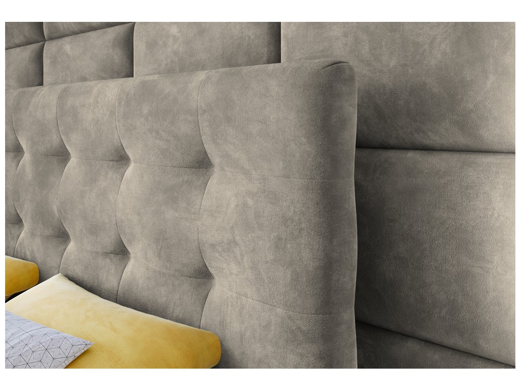 Łóżko kontynentalne Sleepy w rozmiarze 180 cm w jasnym szaro-beżowym welurze Riviera 16 to elegancka i wygodna propozycja dla dwóch osób. Pikowane wezgłowie zwiększa komfort siedzenia i podkreśla przytulny charakter sypialni, a dwa pojemniki na pościel pomagają utrzymać porządek. Solidne materace bonelowe oraz pianka CollFeel gwarantują zdrowy i wygodny sen, a automaty sprężynowe ułatwiają codzienny dostęp do przechowywanych rzeczy.