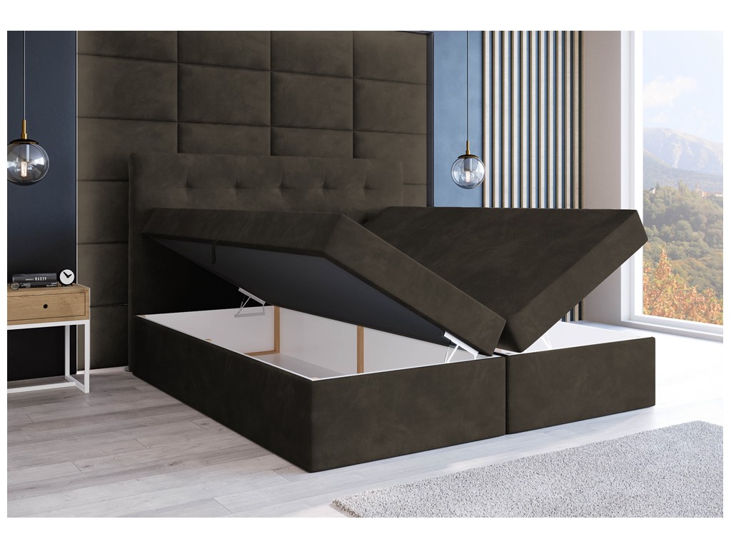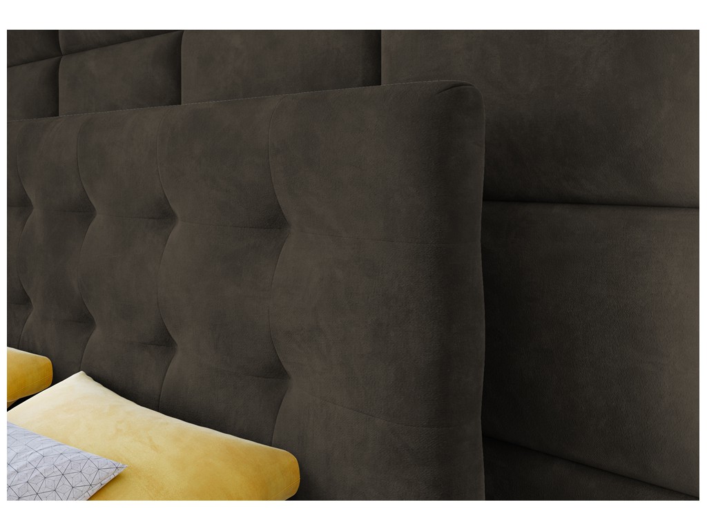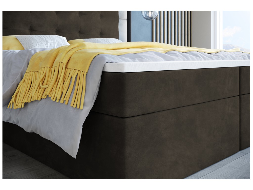 Łóżko kontynentalne Sleepy w rozmiarze 160 cm w ciemnym brązowym welurze Riviera 26 to elegancki wybór dla dwóch osób. Pikowane wezgłowie zapewnia przytulny charakter, a aksamitna tkanina subtelnie odbija światło, podkreślając luksusowy wygląd. Dwa pojemniki na pościel ułatwiają utrzymanie porządku, a automaty sprężynowe zapewniają wygodny dostęp do przechowywanych rzeczy.