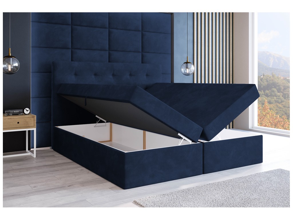 Łóżko kontynentalne Sleepy w rozmiarze 140 cm w tkaninie Riviera 81 to kompaktowy model do sypialni singla lub pary, łączący wysoki komfort snu z eleganckim wyglądem. Granatowy welur i pikowane wezgłowie nadają całości nowoczesny, spokojny charakter, a dwa pojemniki na pościel zwiększają funkcjonalność na co dzień.