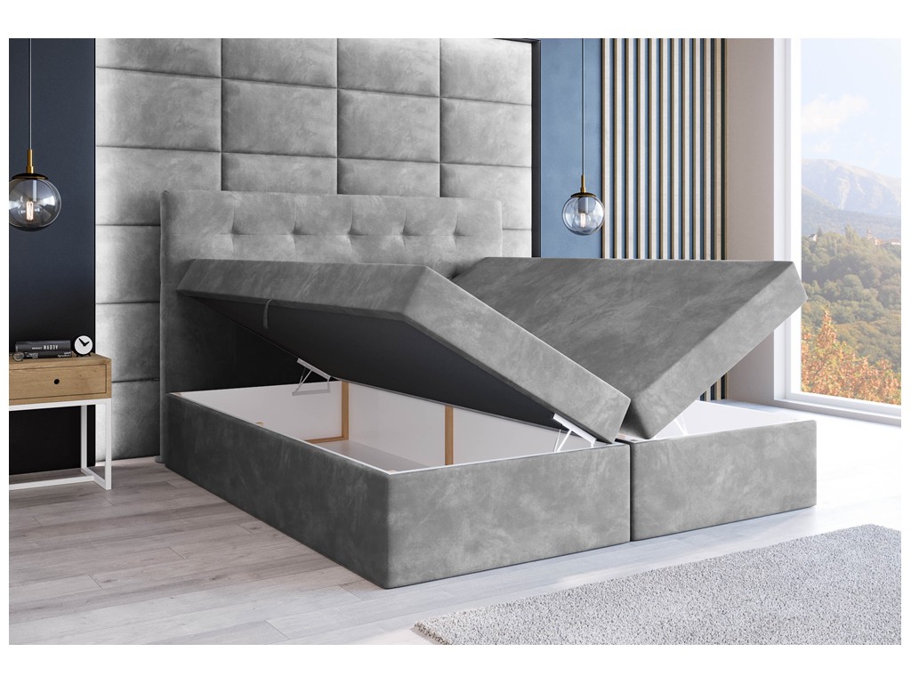 Łóżko kontynentalne Sleepy w rozmiarze 160 cm w jasnym, eleganckim welurze Riviera 82 to komfortowy model do dużych sypialni dla dwóch osób. Miękkie, pikowane wezgłowie i aksamitna tkanina nadają wnętrzu subtelnego połysku. Dwa pojemniki ułatwiają przechowywanie, a automaty sprężynowe zapewniają wygodę codziennego użytkowania.