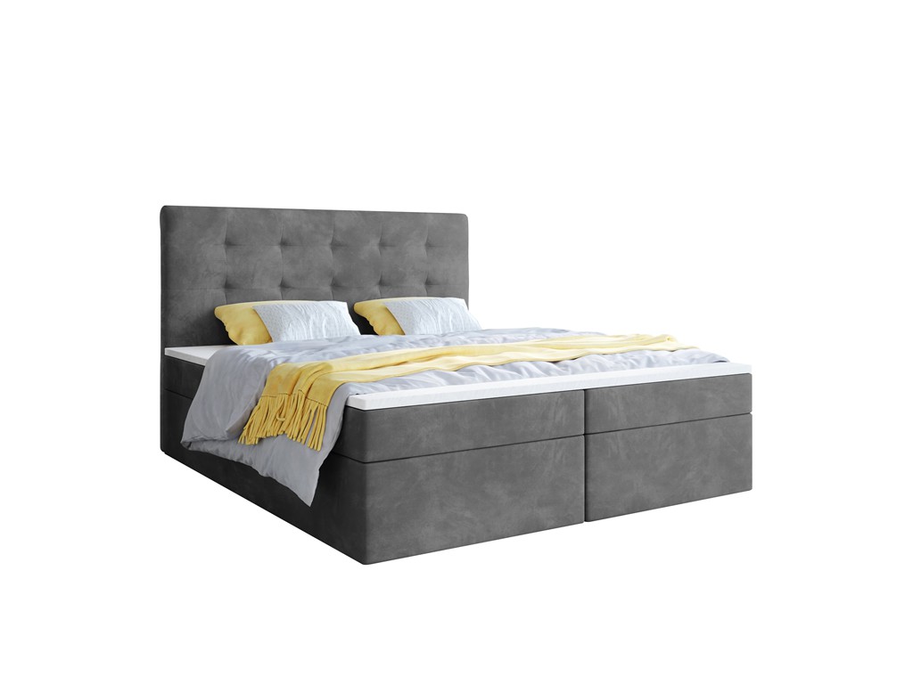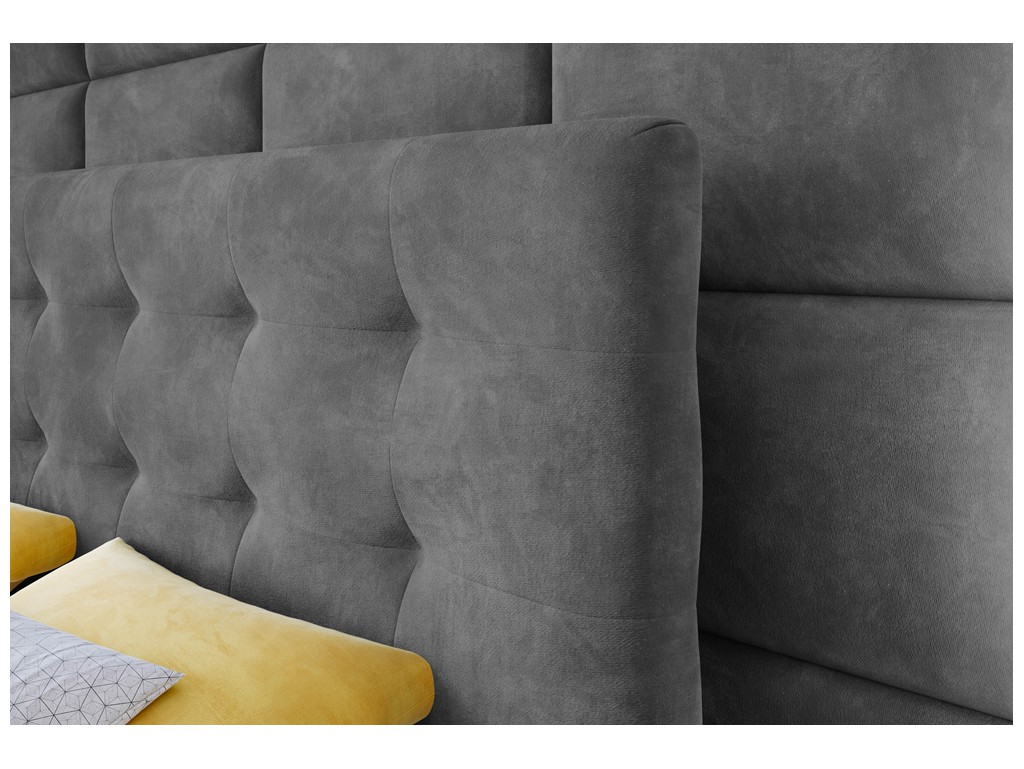 Łóżko kontynentalne Sleepy w rozmiarze 160 cm w szarym aksamitnym welurze Riviera 91 to elegancki i komfortowy mebel dla dwóch osób. Pikowane wezgłowie nadaje mu miękkości i klasy, a dwa pojemniki na pościel zapewniają dodatkowe miejsce do przechowywania. Automaty sprężynowe ułatwiają codzienne użytkowanie, a jego styl harmonijnie wkomponuje się w średnie i większe sypialnie.