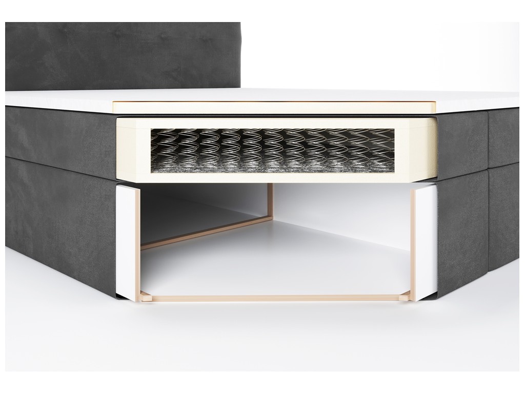 Czy powierzchnia spania wykonana jest z tej samej tkaniny co tapicerka łóżka? - Nie, powierzchnia spania została wykonana z dedykowanej czarnej tkaniny obiciowej materacowej. Takie rozwiązanie poprawia cyrkulację powietrza, zwiększa komfort snu i zapobiega ślizganiu się pościeli.