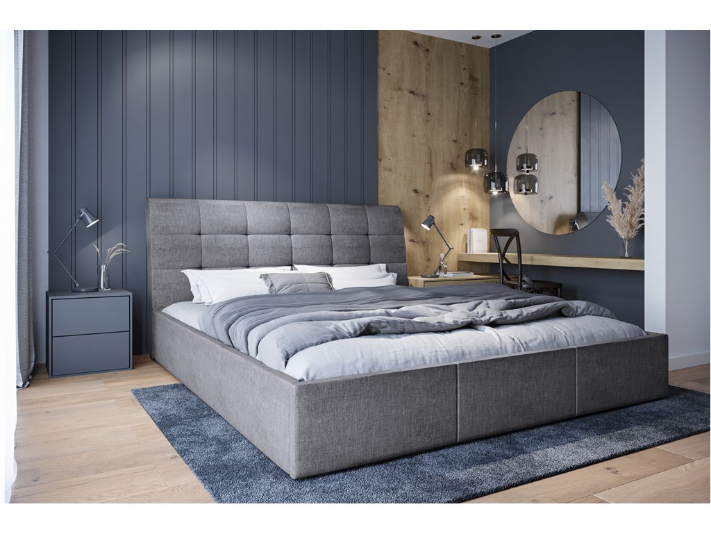 Wbudowany pojemnik pełni funkcję dodatkowego schowka, a tapicerowane wezgłowie zapewnia wygodne oparcie podczas wieczornego relaksu lub czytania książki.