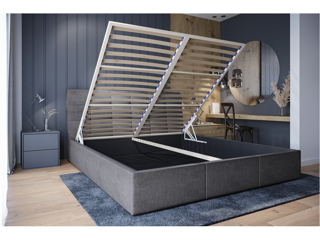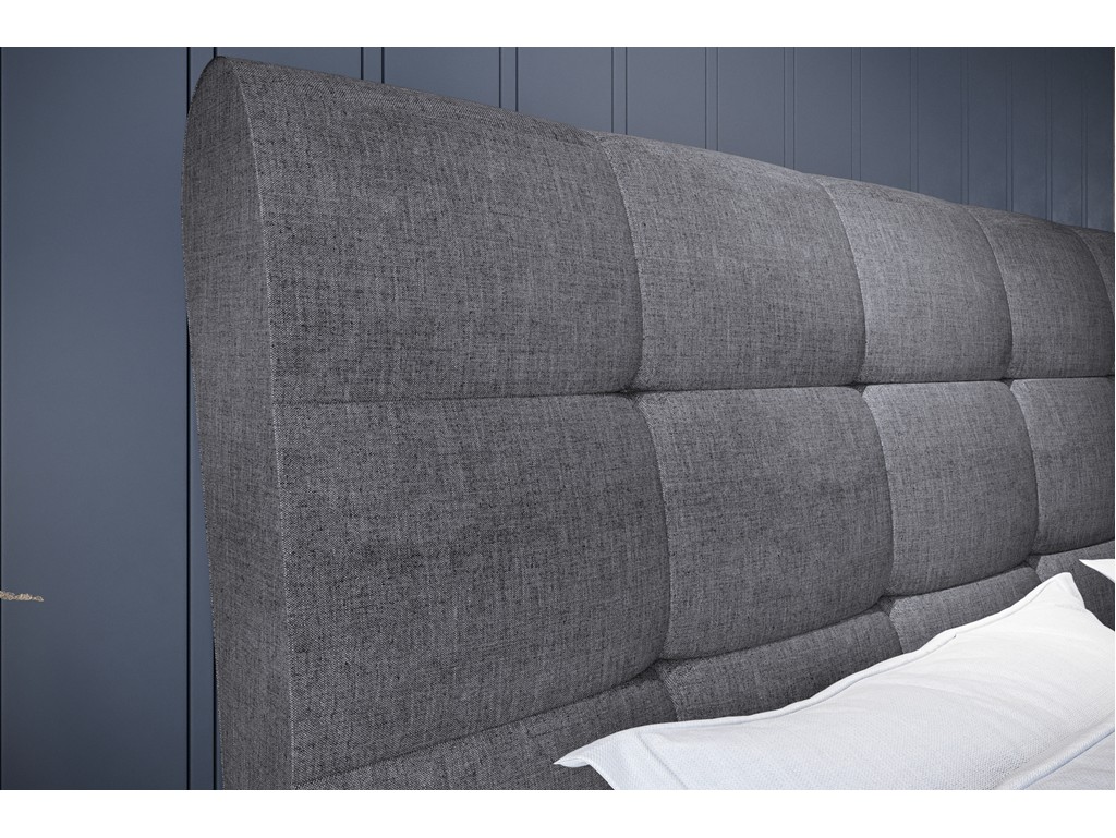 Wbudowany pojemnik pełni funkcję dodatkowego schowka, a tapicerowane wezgłowie zapewnia wygodne oparcie podczas wieczornego relaksu lub czytania książki.