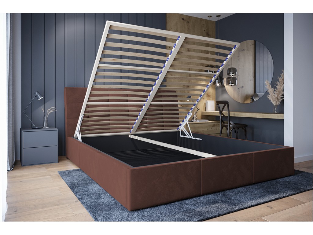 Welwetowa tkanina nadaje łóżku elegancki wygląd oraz przyjemną, komfortową miękkość, a ciepła, nietuzinkowa kolorystyka sprawia, że łóżko stanowi efektowny element aranżacji sypialni.