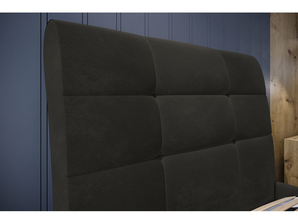 Welwetowa tkanina nadaje łóżku elegancki wygląd oraz przyjemną, komfortową miękkość, a neutralna kolorystyka sprawia, że łóżko łatwo dopasować do różnych aranżacji wnętrz.