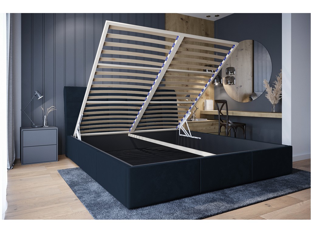 Wbudowany pojemnik na pościel zwiększa funkcjonalność i pozwala lepiej zorganizować przestrzeń w sypialni.
