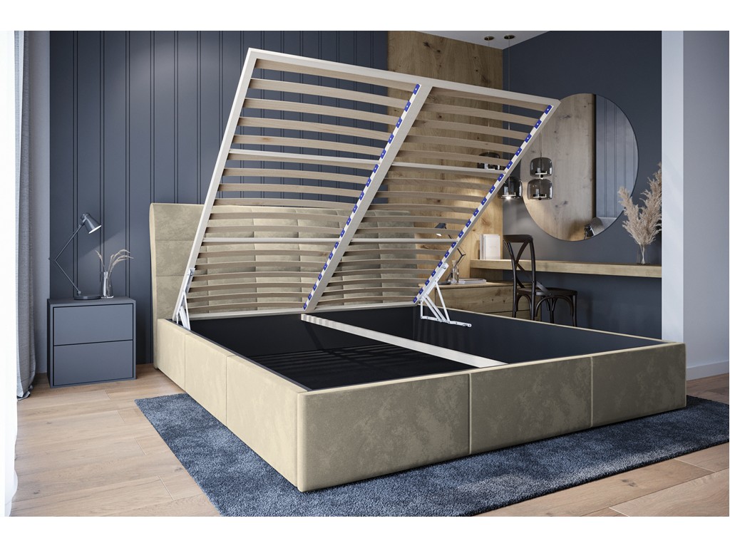 Wbudowany pojemnik na pościel zwiększa funkcjonalność i pozwala lepiej zorganizować przestrzeń w sypialni.