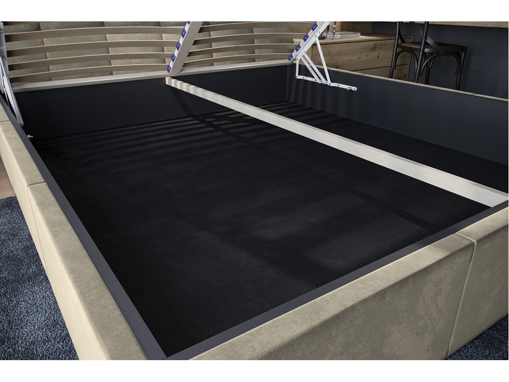 Wbudowany pojemnik na pościel zwiększa funkcjonalność i pozwala lepiej zorganizować przestrzeń w sypialni.