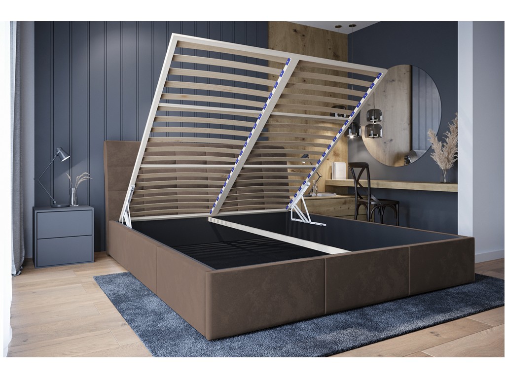 Wbudowany pojemnik na pościel zwiększa funkcjonalność i pozwala lepiej zorganizować przestrzeń w sypialni.