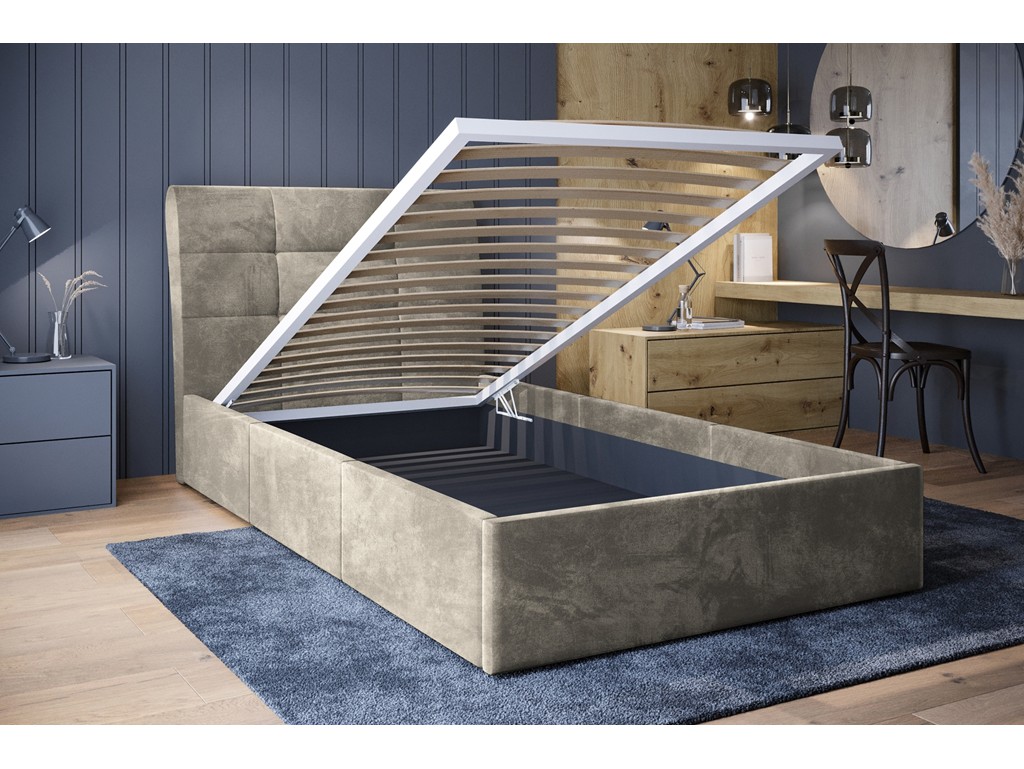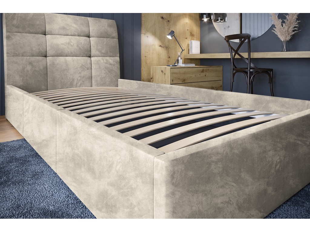 Welurowa tkanina nadaje przytulności i podkreśla elegancki charakter łóżka, a neutralny kolor beżu doskonale komponuje się z różnymi stylami aranżacji.
