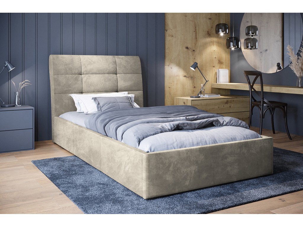 Welurowa tkanina nadaje przytulności i podkreśla elegancki charakter łóżka, a neutralny kolor beżu doskonale komponuje się z różnymi stylami aranżacji.