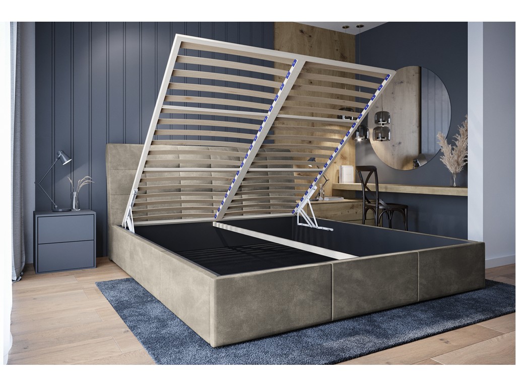 Welurowa tkanina nadaje przytulności i podkreśla elegancki charakter łóżka, a neutralny kolor beżu doskonale komponuje się z różnymi stylami aranżacji.