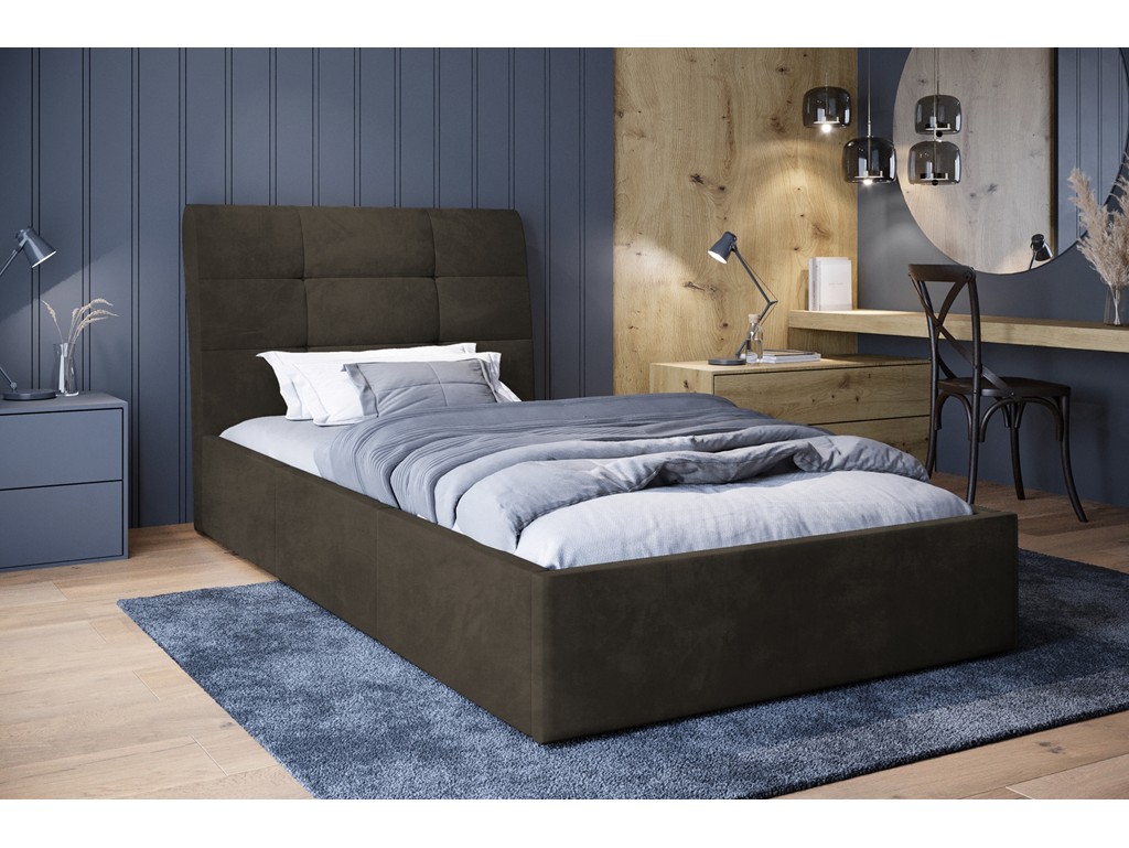 Łóżko tapicerowane Joko w rozmiarze 80 cm w tkaninie Riviera 26 w kolorze ciemnego brązu to funkcjonalna propozycja o eleganckim wykończeniu. Pikowane wezgłowie zapewnia wygodne oparcie podczas odpoczynku i pełni funkcję dekoracyjną. Stabilna tapicerowana rama w połączeniu z drewnianym stelażem gwarantuje trwałość konstrukcji, a pojemnik pod stelażem umożliwia wygodne przechowywanie pościeli.
