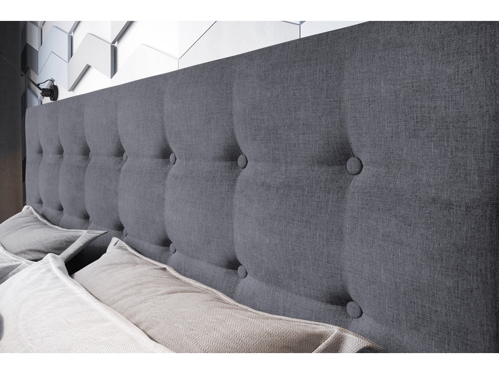Szara tapicerka nadaje wnętrzu elegancji, a pikowane wezgłowie pełni funkcję dekoracyjną i stanowi wygodne oparcie dla pleców.