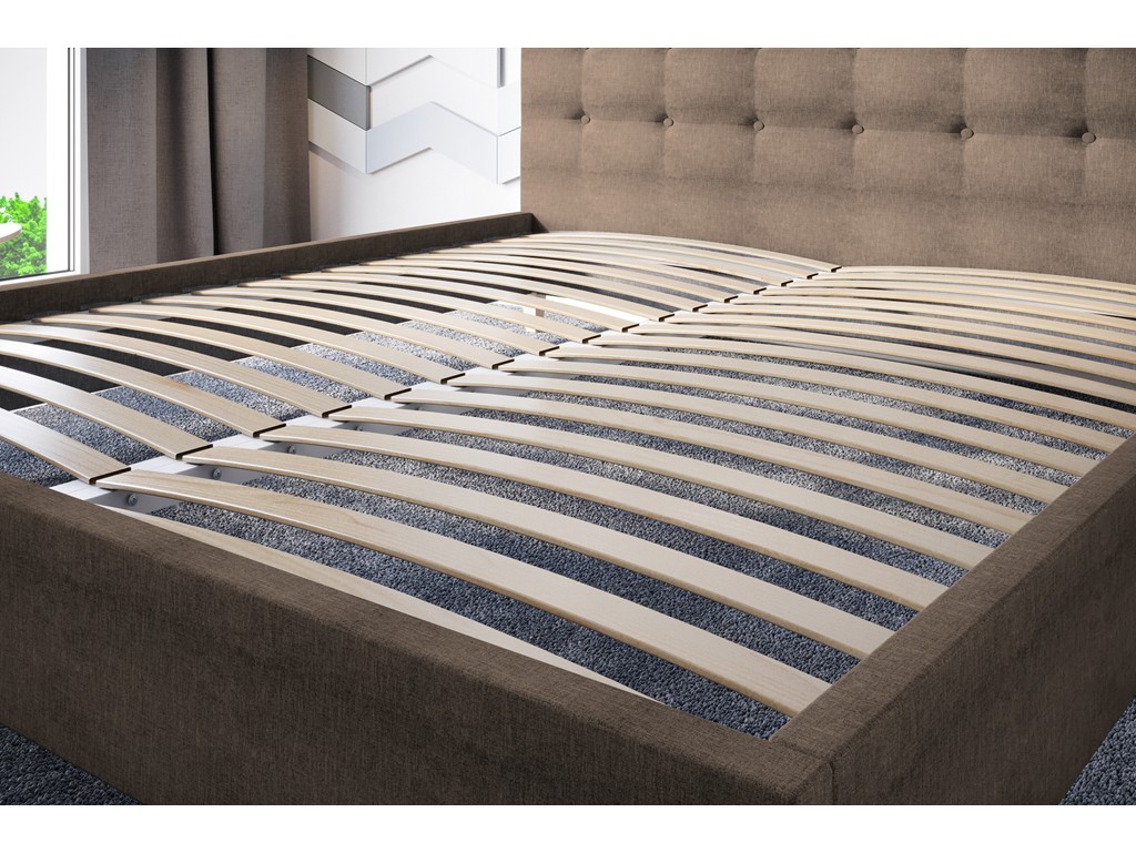 Ciepły brąz materiału nadaje wnętrzu przytulny charakter, a pikowane wezgłowie stanowi wygodne oparcie dla pleców.