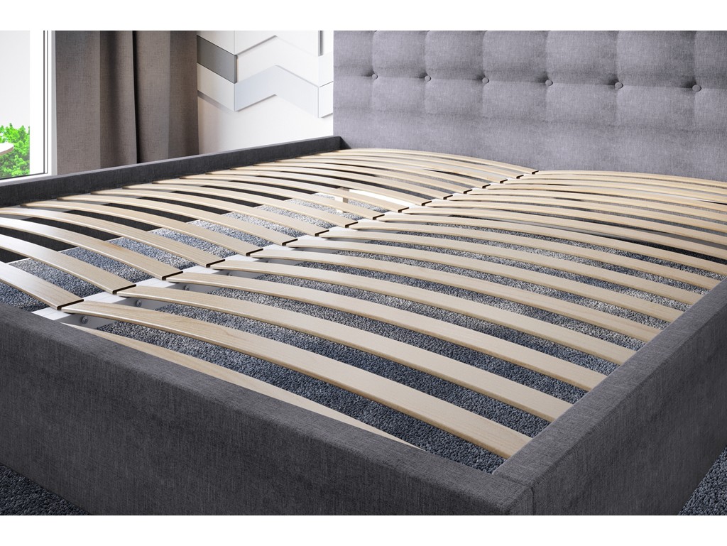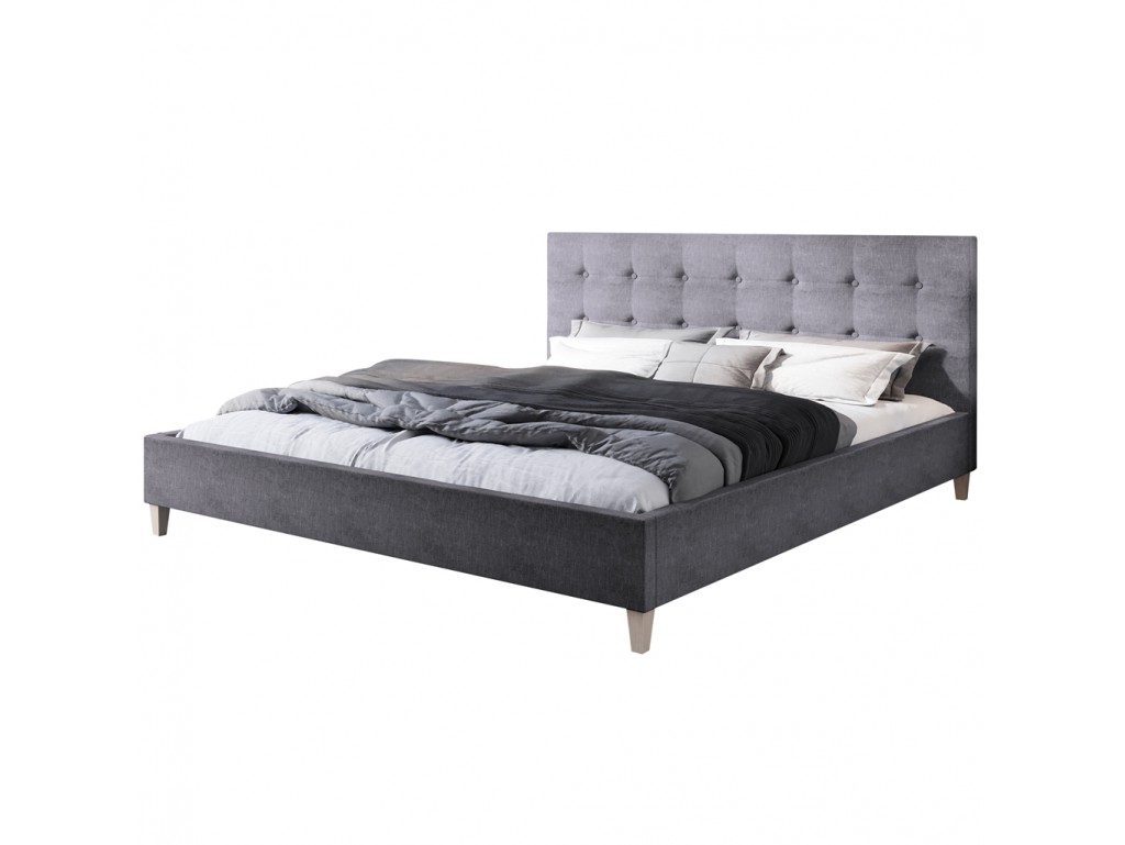 Jasnoszary kolor tkaniny dobrze współgra z minimalistycznymi i nowoczesnymi wnętrzami, a drewniany stelaż zapewnia stabilność i możliwość dopasowania własnego materaca.