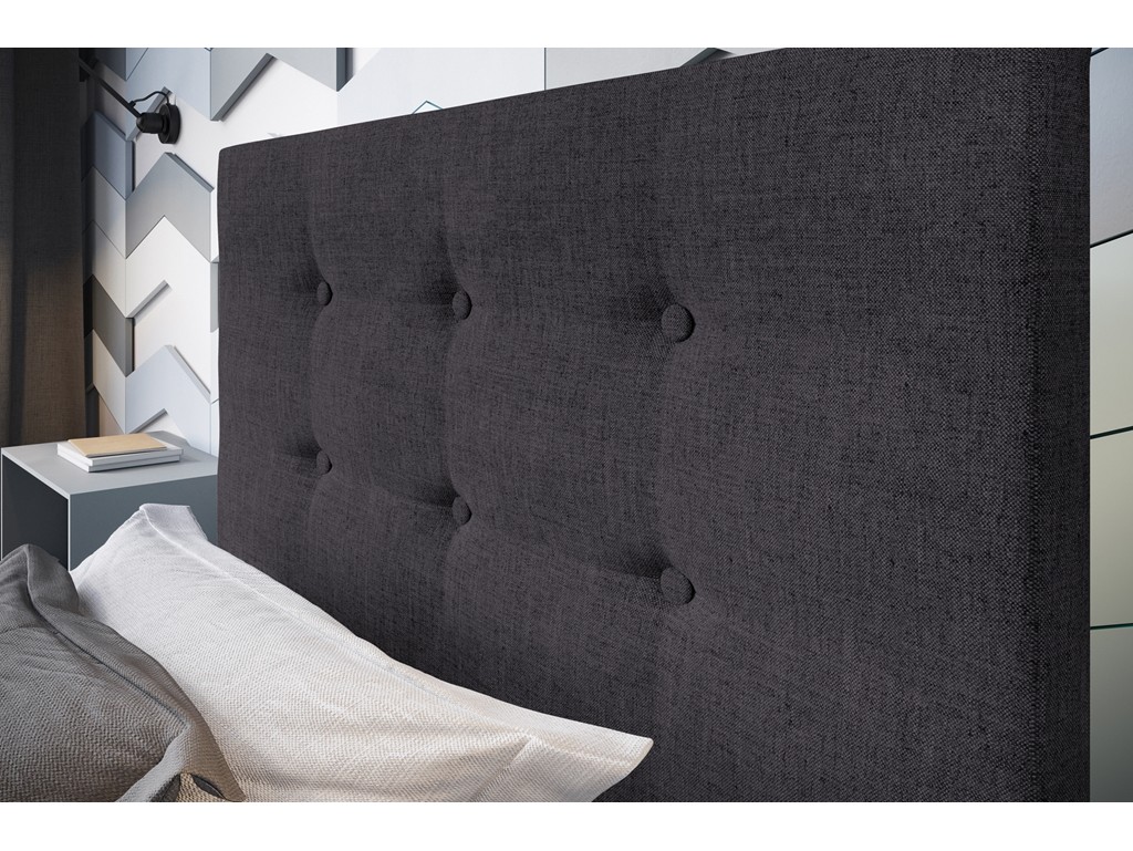Pikowane wezgłowie stanowi wygodne oparcie dla pleców, a ciemnoszara tkanina strukturalna wprowadza minimalistyczny akcent do wnętrza.
