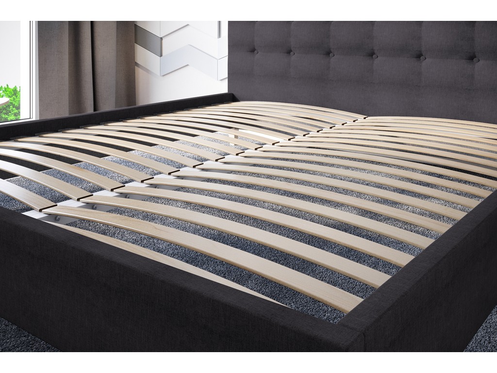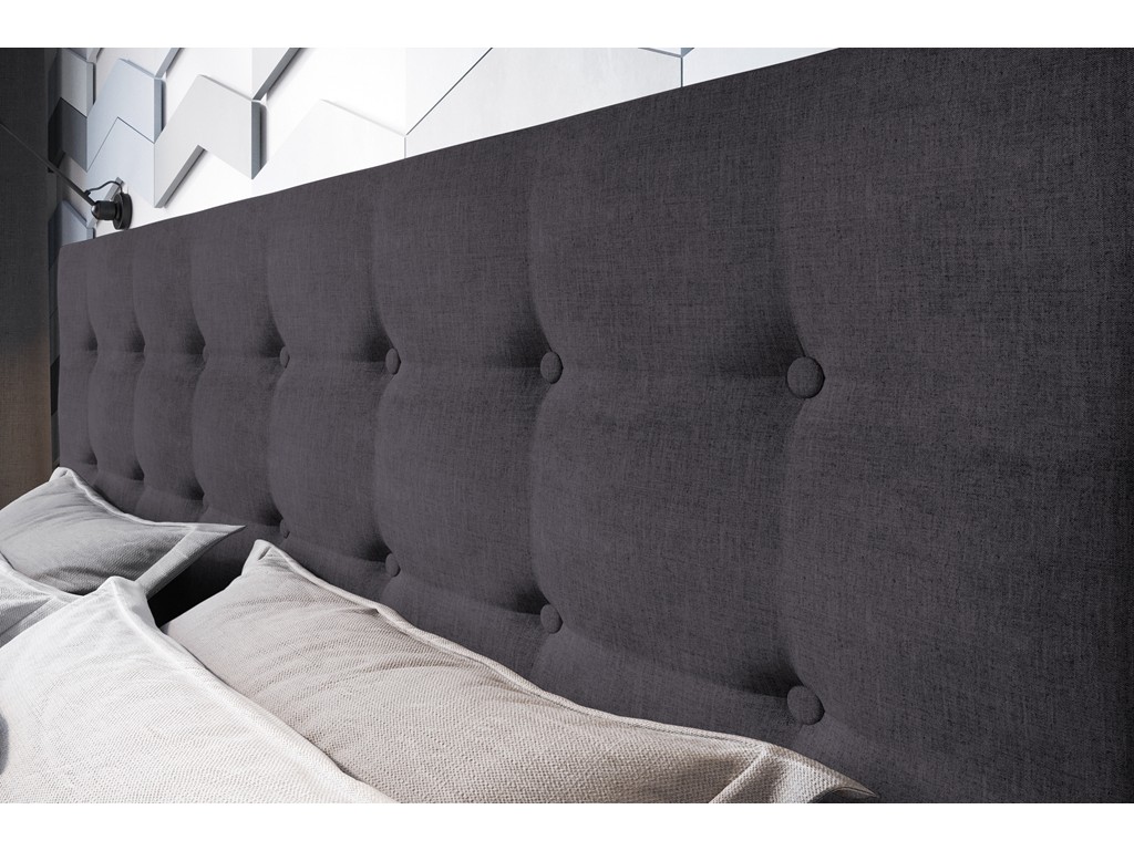 Pikowane wezgłowie stanowi wygodne oparcie dla pleców, a strukturalna tkanina w odcieniu ciemnego szarego wprowadza elegancki, minimalistyczny charakter do sypialni.
