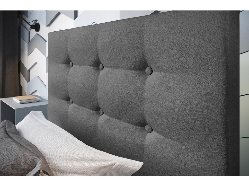 Szara imitacja skóry wprowadza elegancję, a pikowane wezgłowie stanowi wygodne oparcie dla pleców.